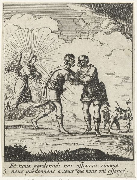 Editor: Here we have Jacques Callot's etching, "Duel with Swords." Considering its diminutive scale, there's a surprising tension! What symbols do you recognize within the combative stances of these figures? Curator: This image pulses with codified aggression. Note the clothing discarded to the periphery – relics of status cast aside for primal contest. Do you think the artist intended a critique of honor culture? Editor: Perhaps. Is the duel meant to represent a larger societal struggle, beyond just individual conflict? Curator: It’s plausible. Images of duels were popular during this period, often symbolizing the broader social anxieties around status, violence, and the fragility of peace. It’s a mirror reflecting a troubled society. Editor: So, even this small print carries echoes of much larger cultural concerns.