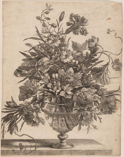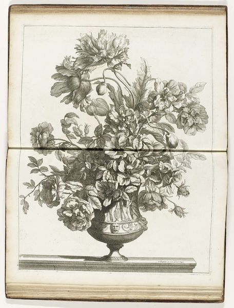 Curator: The interplay of light and shadow immediately catches my eye, demonstrating masterful control over the engraving process. Editor: We're looking at Jean-Baptiste Monnoyer’s "Bloemenvaas," from around 1680-1695, an engraving currently housed at the Rijksmuseum. The composition has a stark, almost scientific quality, due to its high level of detail. What aspects of its materiality or creation interest you most? Curator: This engraving prompts reflection on the economics of image-making at the time. Consider the labour required to produce such a detailed plate. The market would have had to sustain this practice; engravings, as multiples, made art accessible beyond painted works, which were exclusive to elite patrons. Editor: So you're saying its value comes from its reproduction capabilities, as much as from its artistry? Curator: Precisely! How does the widespread availability of such botanical studies, facilitated by the engraving process, affect our understanding of nature in the period? Also, think of the supply chains involved: copper mining, the craftsman who creates the burin used for the work, the paper mill and, subsequently, distribution networks of print sellers and booksellers. Editor: It never occurred to me how many industries this kind of artwork touched. Curator: What, then, do you make of the seemingly ‘natural’ arrangement in the vase itself? Are we truly observing an organic bouquet, or rather, a carefully constructed representation designed to convey status and taste? Editor: I see what you mean! I was taking the subject matter for granted. Looking at it through that lens highlights the careful choices involved, the almost manufactured nature of the image, even before considering the physical act of engraving. Curator: Indeed. It reframes the way we understand the artist’s touch in rendering this scene: the artistic intervention and how it ties to social meaning and material realities. Editor: That has deepened my appreciation of the labor and intent involved in making this kind of art available.