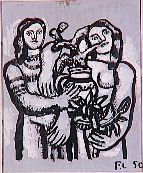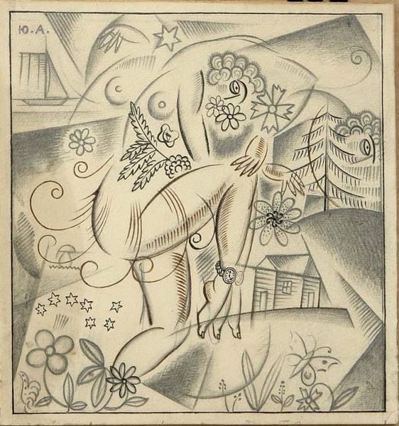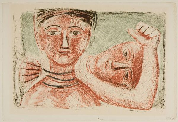 Editor: Here we have Rafael Zabaleta’s pen and ink drawing, simply entitled "A Kiss." There's a strong, immediate visual impact from the distorted but affectionate embrace. The combination of vulnerability and shared experience feels really palpable to me. How do you read into this intimate scene? Curator: This piece speaks volumes about the politics of representation and the socio-cultural role of art, especially within the context of modernism. Consider when and where Zabaleta was working. What did it mean to depict intimacy in such a raw, almost confrontational way? What visual cues signal this 'rawness' to you? Editor: Well, the unfinished lines and visible pen strokes make it feel immediate and personal, and almost childlike. Is that significant? Curator: Absolutely. This 'naivete,' whether intentional or not, complicates its public reception. Is it truly innocent or is Zabaleta using a disarming visual language to challenge bourgeois notions of privacy and public display? The sketch style emphasizes the hand of the artist, placing this expression directly in the social context. The setting reinforces that rawness, the rural location, a landscape with people who lives and struggle there… Zabaleta exposes the beauty and also the drama around their lifes. Do you think it would read differently if it were rendered in a more polished style? Editor: Definitely. A polished style would feel more idealized, less authentic, somehow. The raw linework seems essential to the emotional power of the piece. Curator: Precisely. This choice serves a distinct political function; art historians see that. He highlights their struggle. And as Zabaleta became a public figure, so did their emotions, experiences and lifestyle, a display that broke away with the current establishment. Editor: It's fascinating to see how choices in materials and technique aren't just about aesthetics, but about making a statement about social dynamics, visibility, and the very act of representing lived experiences. Thank you!