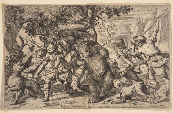 Justus Sadeler created this print called ‘Berenjacht,’ or ‘Bear Hunt,’ sometime around the turn of the seventeenth century. It’s a scene packed with action, showing a group of men and dogs in a fierce struggle with a large bear. Prints like this played a crucial role in disseminating images and ideas across Europe. Sadeler, who was active in the Netherlands, Germany, and Italy, was part of a network of artists and publishers who catered to a growing market for accessible and affordable art. The rise of printmaking coincided with the growth of cities and a new urban culture. Hunting scenes like this were popular, reflecting the interests of the wealthy merchant class. But prints also had a political dimension. They could be used to celebrate military victories, promote religious beliefs, or even satirize social customs. To truly understand a print like this, we can delve into the archives, study the artist's biography, and explore the cultural and political context in which it was made. This will help us understand the complex relationship between art and society.