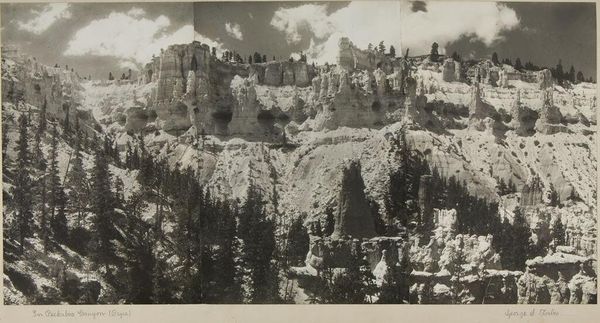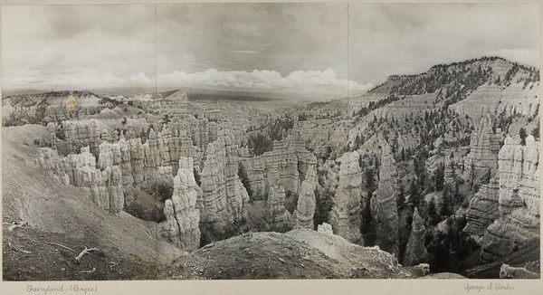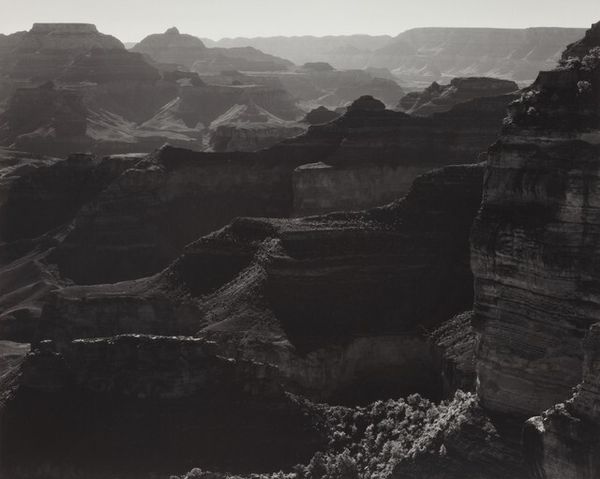 Editor: This photograph, "From Point Imperial, Nankoweap Canyon" by George S. Forbes, captures an expansive view. The monochrome palette evokes a sense of timelessness. What strikes you most about this image? Curator: The grand scale and the way the landscape is presented certainly speak to the history of representing the American West. It romanticizes nature but also suggests ideas of exploration, exploitation, and conservation. Consider how the Grand Canyon became a national park and a symbol. Editor: So, the photograph is part of a bigger narrative about nature and society? Curator: Precisely. It makes you think about the cultural and political forces that shaped our understanding and interaction with such landscapes. Editor: I see it now! This photo isn't just a pretty picture; it's part of a much larger story.