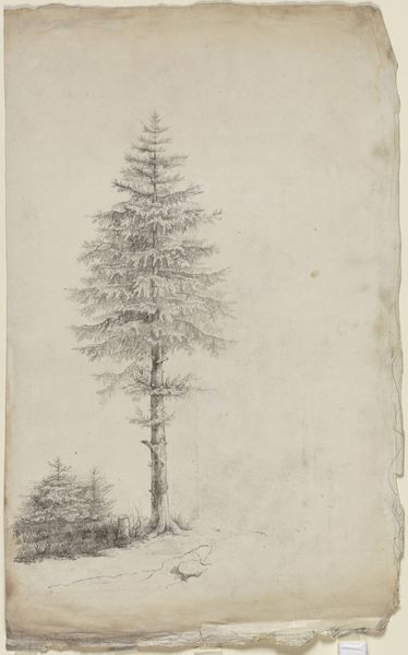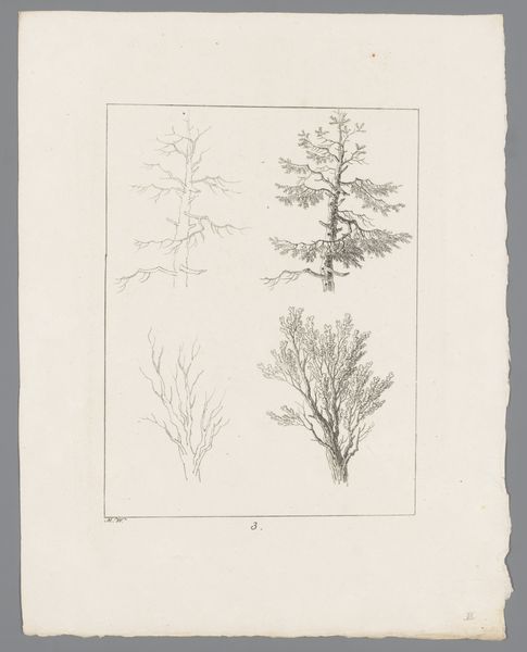 Curator: Looking at this pen and pencil drawing, known as “Treetop”, one can immediately note the artist's keen eye for detail. The work is currently housed here at the Städel Museum. What’s your initial take on this landscape sketch? Editor: It strikes me as both fragile and resilient. There's a kind of delicate beauty in its simplicity, but also a strength suggested by the upward reach. I find myself thinking about environmental precarity looking at it today. Curator: Absolutely, it is evocative. Consider the paper itself, a material produced through labor. The method reflects an industry, the social implications of which must not be forgotten. Notice how the pencil markings capture the different light qualities across the tree. The paper as the backdrop, the material substance onto which labor meets with the creative act of drawing. Editor: Precisely. This invites a reflection on land usage. We might explore this image in relation to land ownership. We may well understand "landscape" as a projection of cultural ideals but not detached from politics, race, class, and the historical conditions shaping land access and aesthetic sensibilities. Who owned the land depicted? Whose gaze is centered in this drawing? Curator: Interesting points. The marks themselves document a direct encounter between hand, tool, and medium. The varying densities reveal not only light, but also the changing pressure and focus of the hand, marking duration of the labour. Editor: Indeed, we must then acknowledge how land in visual art often omits signs of labour. The sublime presented may obscure issues of gendered, racialized labour. Here, the bare branches perhaps hint at an environment under stress. Curator: Looking more closely at the craft involved, one cannot but consider that the consumption of landscape artworks such as "Treetop", becomes entwined with ideas of ownership and enjoyment in specific cultural contexts. Editor: And what is deliberately not shown can often reveal implicit assumptions. It compels a deep investigation of societal biases in ecological settings. Curator: It provides rich material to continue discussions related to resource exploitation. Editor: I think so, it encourages critical dialogue. A very important contribution!