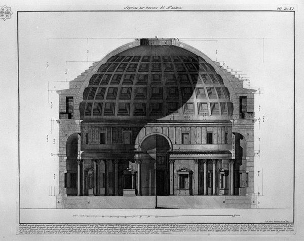Sébastien Leclerc I created this cross-section of the Pantheon in Rome using etching techniques. Leclerc, working in the 17th and 18th centuries, lived in a time when European artists were deeply engaged with classical antiquity. This print offers us a look into the architectural marvel of the Pantheon, inviting reflections on power, knowledge, and cultural legacy. Leclerc’s detailed rendering provides a way for viewers removed from the site, whether by distance or time, to envision themselves in this grand space. It is a powerful reminder of how architectural drawings are not just technical exercises, but cultural artifacts that shape our understanding of history. Through Leclerc's eyes, we see the Pantheon not just as a building, but as a symbol of human potential and historical continuity. It's a poignant look at how we interpret and reimagine the past through the lens of the present.