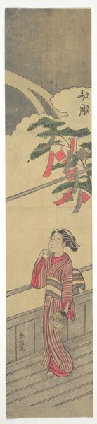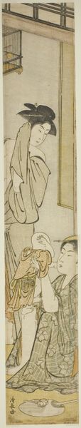 Curator: This captivating woodblock print is entitled "Courtesan Writing a Letter as Two Men Watch through a Window Lattice," dating from around 1769-1770. It comes to us from the renowned Suzuki Harunobu. Editor: The first thing that strikes me is the sense of voyeurism. We are implicated in their gaze, intruding on this intimate moment. It's unnerving, yet… strangely compelling. Curator: That tension is central to understanding ukiyo-e prints of this period. The floating world—the world of pleasure and entertainment—was highly regulated. Displays of wealth and sexual freedom existed within a complex social hierarchy. The gaze itself was a commodity. Editor: Absolutely. Who were these men, really? Were they potential patrons, perhaps? Or were they stand-ins for the broader patriarchal gaze that defined a courtesan’s existence? What agency did she possess? Curator: Her power resided in her skill and charm. Literacy, demonstrated by her act of writing, set her apart and enhanced her allure. Consider the carefully arranged kimono, the elaborate hair. These were tools of her trade, projecting a desired image. The letter itself suggests a personal connection, but could it simply be a performance? Editor: It highlights the complex role of women during the Edo period. The artistic choices made by Harunobu certainly open a space to question their role. By peeking through the window frame, we participate in this dynamic—as observers and potential consumers. Curator: It's also important to acknowledge how this image circulated. Printed multiples allowed this scene, both tantalizing and restricted, to enter different homes. So, what impact do you think it had? Editor: Did this work act as propaganda that was attempting to promote idealized concepts and understandings? Maybe to promote fantasies about these subcultures as well? Perhaps the goal was never full representation. It served to offer a glimpse into the floating world to a wider audience, feeding both fascination and a kind of…sanctioned curiosity? Curator: These prints were incredibly powerful in their ability to shape perspectives about status, art, leisure, and society itself. Editor: Harunobu's print isn’t just a pretty picture; it’s a document—a cultural artifact that can help unpack the visual culture of its time, and maybe ours.