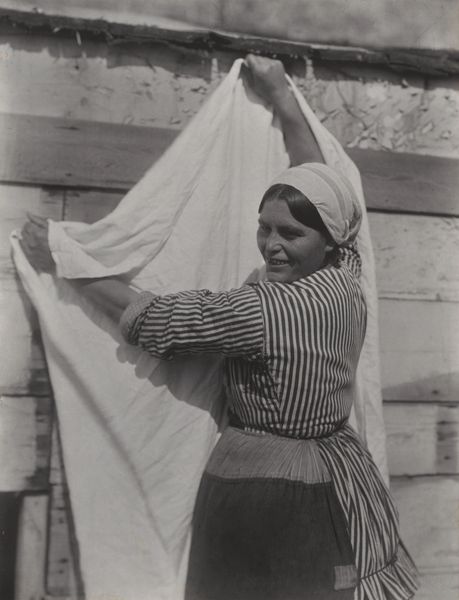 This photograph, titled 'Wasvrouwen' or 'Washerwomen', captures three women engaged in a laundry task with a galvanized tub, a woven basket, and simple textiles. The material reality of this image speaks volumes. The choice of galvanized metal for the tub is significant, reflecting a move towards more durable, mass-produced materials that were becoming increasingly available. The woven basket, on the other hand, hints at more traditional, craft-based practices. Look closely at the women's aprons and headscarves, these details speak to the everyday, working lives of these women, their clothing chosen for practicality rather than display. The photograph itself, with its grainy texture and stark contrast, further enhances the sense of realism, grounding the scene in a specific time and place. Consider the labor involved in the depicted task. Before modern washing machines, laundry was a physically demanding process, often relegated to women. This image, therefore, not only captures a moment in time but also reflects broader social issues of labor, gender, and class. By focusing on the material and the making, we can appreciate the full cultural significance of this seemingly simple photograph, challenging conventional ideas about what constitutes art and craft.