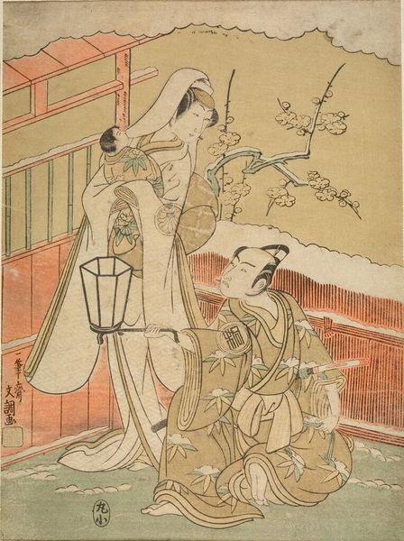 Editor: Here we have Torii Kiyonaga’s "Poet Ono no Komachi Standing Beneath Willow by a Stream," currently housed at the Harvard Art Museums. I'm struck by the delicate lines and muted palette, creating such a serene and contemplative mood. How do you interpret this work? Curator: It whispers of melancholy and fleeting beauty, doesn't it? Kiyonaga masterfully captures the essence of Ono no Komachi, a legendary poet known for her passionate verses and later, her decline into poverty. I see the willow as a symbol of her sorrow, its weeping branches mirroring her own lament. The stream, a symbol of time flowing ever onward, washing away youth and fame. Does the poem capture the passing of time for you too? Editor: Absolutely. The flowing water next to the poet makes me think about how life is always changing. Curator: Precisely! What Kiyonaga has done here is distilled the essence of a life lived fully, its joys and sorrows intertwined. I feel a deep connection to the human experience, don't you? Editor: I do. Thank you for sharing your insights, it has provided me with a fresh perspective on this captivating artwork.