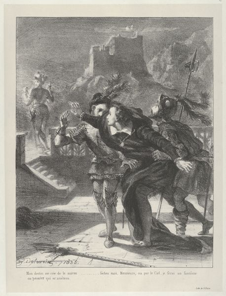 Curator: This engraving, titled "Frezin door Goignies gedood, 1581," created in 1787 by Theodoor Koning, vividly depicts a historical moment, currently held in the Rijksmuseum collection. What strikes you first about this print? Editor: The dramatic chiaroscuro, the extreme contrasts between light and dark, immediately create a sense of impending doom. The figures seem caught in a moment of brutal action, lit by what looks like a single torch. It’s visually very arresting. Curator: Indeed, Koning masterfully employs line and light to create this sense of drama. The torch serves as a focal point, not only illuminating the central struggle but also drawing the eye to the historical narrative. The killing of Frezin by Goignies in 1581. Editor: The choice to represent this specific historical event carries significant weight. What was Frezin, the person murdered by Goignies, symbolizing for people at the time? Who commissioned Koning to do this engraving in the late eighteenth century? Curator: "Frezin door Goignies gedood, 1581" memorializes the actual killing of Frezin. And even the artist, Koning, has inscribed that in its title. Here, we note a continuation of violence as cultural memory. Koning, who dedicated himself to the study of the fine line, offers us a print dominated by the grisaille method. In its reliance on gradations of grey to model form, we see how much of what came before fed into his artistry. Editor: You make an excellent point about the grayness lending itself to the sombre, historical scene represented. The very absence of colour forces us to confront the gravity of the event, doesn't it? It lends the whole piece a stark, unromantic air, stripping away any potential for glamour in the violence. I hadn't thought about this being Koning's conscious artistic choice. Curator: That lack of "glamour" also challenges the romanticization that so many other narrative paintings from that period relied on, doesn’t it? It is almost a pre-cinematic scene due to the composition's rawness, capturing both tension and chaos in equal measure. Editor: Absolutely. Well, this has definitely shed some light on the narrative. It reminds us to consider the symbols within their historical framework and beyond as powerful shapers of memory and cultural identity. Curator: Indeed. Through his mastery of the engraving medium, Koning provides a timeless lens to understand both historical and psychological undercurrents.