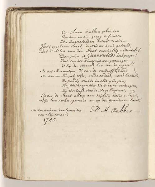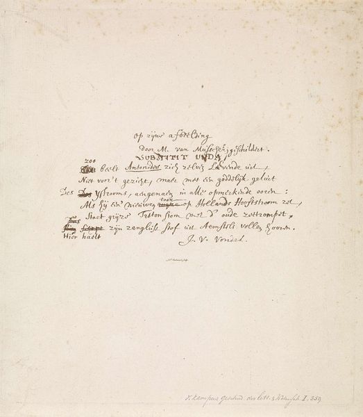 This handwritten poem by Kornelis Boon van Engelant is a meditation on the sword used in the execution of Johan van Oldenbarnevelt in 1619. Here, the sword becomes a potent symbol, dripping with historical and emotional weight. Boon van Engelant, writing decades after the event, imbues the blade with the dark stain of injustice, a stain that evokes not only the physical blood, but also the moral implications of political violence. This is not merely an object; it's a vessel carrying the agony and outrage of a nation. Consider the recurring motif of the sword throughout history—from the Damocles sword of Greek antiquity, which represents impending doom, to the medieval knight's sword, symbolizing honor. Each era imbues it with new layers of meaning, altering its cultural significance. Similarly, the symbolic power of blood as a signifier of sacrifice and life echoes through cultural memory, manifesting differently across time, yet consistently engaging with deep, subconscious levels of our psyche. Thus, the poet transforms the sword into a complex symbol, resonating with historical trauma and a potent emotional charge that lingers long after the execution.