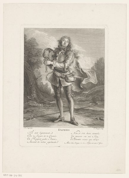 Curator: The texture in this drawing almost seems to breathe. Editor: That's right, what you are noticing is a work titled "Herderin met spintol," attributed to Jean Michel Liotard and created sometime between 1712 and 1772. The piece, an etching, belongs to the Baroque style. It’s a delicate genre scene rendered on paper. Curator: "Delicate" captures it. The use of line creates an almost ethereal atmosphere. Look at how the woman is centrally placed; the artist uses the full vertical extent of the paper. There's a symbolic weight implied, yet there's lightness, even airiness. Editor: Indeed, the spintol itself – that tool for spinning – carries a weight beyond its function. In many cultures, the act of spinning is associated with fate, with control over destiny. Does she perhaps represent the industrious virtues that were seen as so important in this era? Curator: Precisely. The careful cross-hatching creates an elegant interplay of light and shadow. It speaks to a complex relationship between virtue and societal roles of women and the era’s economic realities. There's also that idyllic background contrasting with the task itself. She isn't a noble lady, she's grounded, of the land. Editor: Yes, there is a real sense of idealization here—a conscious rendering that goes beyond pure representational intent. And despite the simplicity, the work does not lose meaning. What initially appears pastoral in sentiment also gives us a visual language about productivity, status, and virtue. Curator: The piece also highlights, quite successfully, the power of images in conveying emotional nuance through simple tools. It prompts us to explore and investigate historical, social, and personal perceptions in ourselves. Editor: Agreed. "Herderin met spintol" serves as a beautiful, intricate example of an enduring visual shorthand with an extraordinary capacity to reach us, still, today.