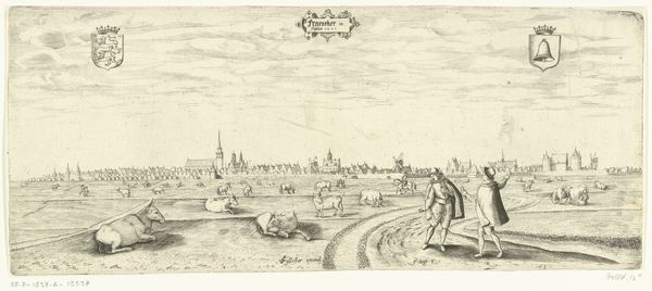 Curator: What an intriguing cityscape. Its geometric form, framed within that decorative border, presents an ordered reality. Editor: It feels bustling, though, even with the limitations of the medium. A vibrant snapshot of urban life. Let’s delve in. Curator: Certainly. We’re observing Jacobus Harrewijn’s "Gezicht op de Ooster Oude Hoofdpoort," or "View of the Eastern Old Head Gate," dating approximately from 1696 to 1730. An engraving using metal, now held at the Rijksmuseum. The emphasis on line and form are immediately apparent. Notice how each stroke delineates space and shape? Editor: Yes, but it’s more than just form, isn't it? It documents the intense social and commercial activity around the port. The gate itself wasn’t just a structure; it controlled trade, levied taxes… it was a point of power and a reflection of Rotterdam’s maritime importance. Curator: True, the visual language presents power, which is a language itself. Note the positioning of the "Oude Hoofd Poort" banner, hovering above the main structure, reinforcing the gate's dominance through graphic design. Editor: Precisely. It projects authority while also creating a sense of civic identity. And if you examine the foreground, those people aren’t just filling space, they're indicators of commerce and labor. Curator: Observe, also, the artist’s command of perspective. The lines converge, focusing the eye on the gate itself, drawing attention to this controlled entry. There’s a tension between the static architecture and implied movement. Editor: I wonder, looking at it now, what Rotterdam residents made of it. Was it intended as propaganda? Just a commodity? It definitely speaks to an urban audience, involved in trade and navigation. Curator: Well, in totality, the artwork speaks volumes about structural stability but, viewed through the lens of function and impact on its audience, the experience can expand significantly. Editor: It's amazing how this scene captures a moment frozen in time but resonating across centuries. Thank you. Curator: Agreed, our conversation helped reveal how form and history dance to deliver an experience that extends far beyond its aesthetic trappings.