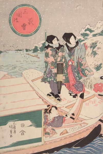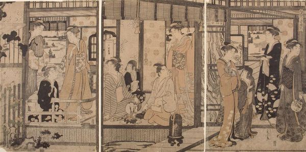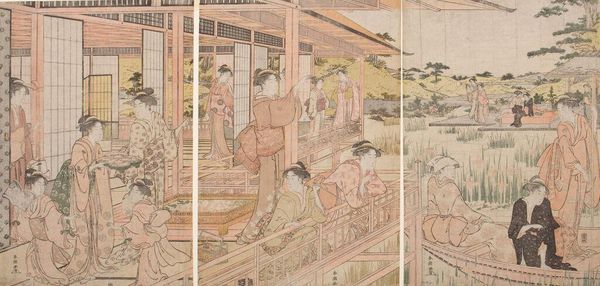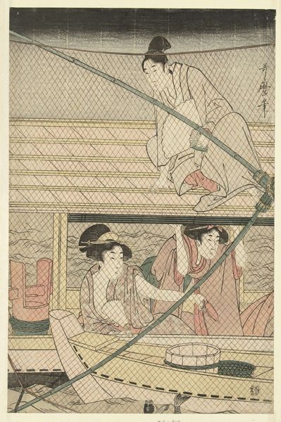 Editor: This is Kitagawa Utamaro's print, Scoop-net (Sumida River), from the Late Edo period. It's a woodblock print on paper, and the netting in the image gives it such a unique visual texture. How do you interpret the netting and the women in this work? Curator: The net acts as both a visual and symbolic barrier, doesn't it? It separates us from the intimate world of these women on the Sumida River, perhaps suggesting a fleeting moment, a glimpse into their lives, a cultural memory. What stories do you think it holds? Editor: I hadn't thought about the "barrier" aspect! It does make you feel like you're peeking into a private scene. The women seem so focused on their task. Curator: Indeed. The act of fishing, usually seen as a common chore, is elevated here to something quite evocative. The netting also alludes to fragility. It filters our gaze and perception. Editor: That's fascinating, I love how the image can be interpreted in so many ways. Curator: Exactly! Art allows us to connect with the past, and to see its layers of meaning unveiled across time.