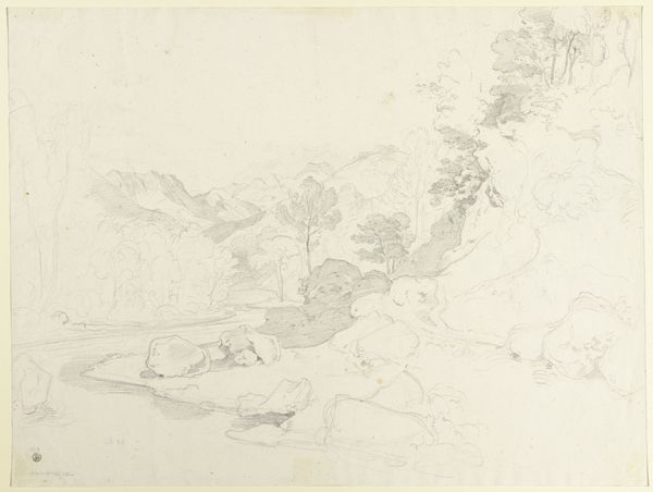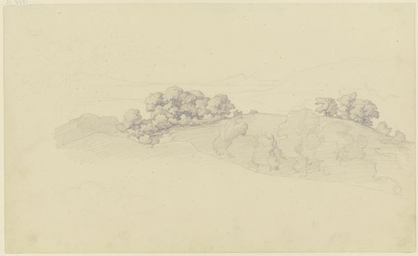 Curator: We're now looking at Ludwig Metz's 1869 drawing, "Simon's Grave," executed in pencil on paper and part of the Städel Museum collection. Editor: Immediately, I'm struck by how desolate it appears. It’s such a sparse rendering, almost like a fading memory. The soft graphite creates this muted, almost dreamlike quality. Curator: Metz's landscapes were often about conveying a sense of place tied to historical narratives. The 'Simon' of the title most likely refers to Simon bar Kokhba, the leader of the Jewish revolt against Roman rule in the 2nd century CE. Sites connected to him carried enormous symbolic weight for Jewish communities, even centuries later. Editor: Right, so this seemingly simple landscape is imbued with layers of political and cultural significance. Is it a site of mourning, a symbol of resilience, or a reminder of past conflicts? Probably all three, woven together. The fact that it's just a drawing amplifies this feeling of impermanence and the delicate balance between remembering and forgetting. Curator: And remember that museums themselves play a key role in this narrative. By choosing to display this artwork, the institution actively shapes the public's understanding of that historical landscape. There is a tension here between history, memorial, art and politics. Editor: Definitely. Think about the impact that choices have—who decides which narratives are visualized and memorialized. I can’t help but wonder about the perspective of those who fought and died; are they acknowledged within this piece? Curator: Good question. I agree; its depiction invites us to consider whose story we’re really seeing and who shapes this historical narrative. Editor: It makes you consider how artists and cultural institutions reflect, reinforce, and, sometimes, subvert established views of historical struggles. It’s more than just a picture; it’s an intersection of politics, memory, and identity. Curator: Looking at the social implications certainly adds another dimension to this artwork. It gives me some new insights to consider, too. Editor: Same here! Thinking about who controls these narratives makes the image even more compelling, doesn't it?