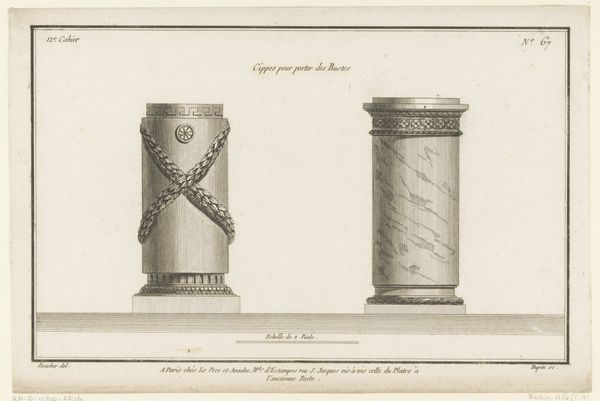 Nicolas Dupin created this print called, "Two pedestals and a column," in France in the late 1700s. Architectural drawings like this one, with its precise lines and measurements, were typical products of the French Enlightenment, a period that valued reason and order. The image shows three classical pedestals, each slightly different, yet sharing similar decorative motifs. These designs reflect the revival of classical forms that was popular in Europe at the time, and the pedestals themselves would have been seen in the homes of the aristocracy. Their clean lines and balanced proportions were a deliberate departure from the more ornate styles of the preceding Baroque era, a change driven by an increasingly powerful middle class. Art historians consult pattern books, architectural treatises, and social histories to understand the cultural values that underpinned the design and use of objects like these. Only through a deep understanding of social conditions can we fully appreciate the meaning and significance of art from any period.