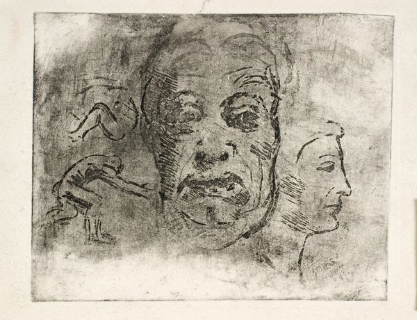 Christian Rohlfs created this print, Large Heads, using linoleum and fabric. The expressive faces have been rendered in thick blue lines against the raw woven material. Linoleum, commonly used for flooring, lends itself to bold graphic forms due to its ease of carving. Rohlfs has exploited this quality, creating strong contours which define the figures' features. The choice of fabric as a printing surface is significant; its coarse texture contrasts with the smoothness of the linoleum block. The rawness of the materials contributes to the overall aesthetic. The juxtaposition of an industrial material like linoleum with a humble fabric grounds the artwork in everyday life. It blurs boundaries between high art and utilitarian craft, inviting us to consider the social context in which it was made. The roughness of the printing and the unhemmed edge emphasize the directness and immediacy of the work, highlighting the artist's hand and the inherent qualities of the materials.