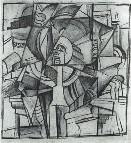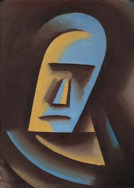 Sorel Etrog’s “Hinged Head” is a drawing, and it looks like it was made with colored pencils. What grabs me is this idea of a head not as one solid thing, but as a bunch of parts joined together. The color is warm, almost like old photographs, or maybe the color of clay. It's built from straight lines and regular forms, not flowing curves, which gives it a machine-like quality. Take a look at the hinges themselves. They’re repeated, like a pattern, but they’re also disrupting the face, breaking it up. That one that cuts across the nose – ouch! It reminds me of Picasso, but more like a robot version. Is he thinking about how we’re all constructed, made of different pieces? It makes you wonder, what holds us together? Or maybe it's about how easily we can fall apart. It puts me in mind of Picabia, someone who liked to mash up humans and machines in his work, too.