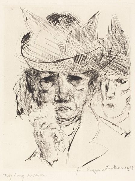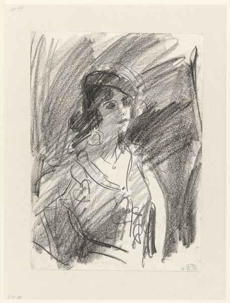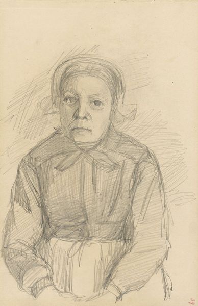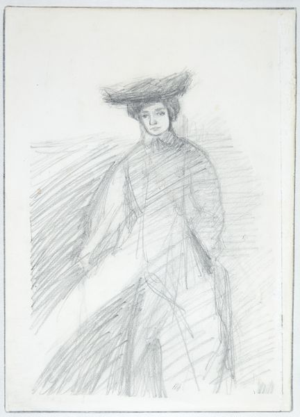 Editor: Here we have Jakob Nussbaum's "Head of a Lady with Veil," created in 1909. It's a pencil drawing on paper. There's a haunting quality about her gaze; what do you make of it? Curator: Haunting is spot on. To me, it’s the expressionistic spirit, isn’t it? That raw vulnerability captured with just a few, albeit intense, pencil strokes. She looks almost… tormented, or at the very least deeply contemplative. Makes you wonder what’s behind the veil, doesn't it? What do you think the veil adds? Editor: It obscures, yet it also hints at a hidden narrative. Like she’s intentionally distancing herself from the viewer while still allowing us a glimpse. Perhaps it’s representative of the societal expectations of women at the time? Curator: Exactly! The societal pressures, the veiled emotions… Nussbaum seems to be exploring the inner life of this woman. The sketchy lines and unfinished areas add to this sense of in-betweenness, a mind in process. And her eyes... do they hint at sadness or defiance? Editor: Maybe it’s both? Sadness about her circumstances, but defiance in allowing her inner life to be perceived, even through a veil. Curator: I love that. It’s like a quiet scream, beautifully rendered. Art can be this amazing, you know? A whisper that roars. What a master, Nussbaum, to achieve this. Editor: Definitely given me a lot to consider about portraiture and expression. Curator: Indeed. It is a gift to look through another's eyes, is it not? And that, my dear friend, is art in a nutshell.