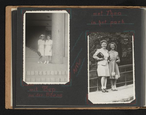 This is a photograph of Wilhelmina van Zijll de Jong and Henriëtte Wassink, made by an anonymous photographer at an unknown date. The monochromatic tones are striking, like a painting rendered in shades of gray. It makes me think about how the photographer saw the world, reducing everything to tonal values, a process that, in itself, is an act of interpretation, and even a kind of translation. Consider the backdrop, the way the house fades into the soft mist, the branches a skeletal tangle against the sky. The darkroom work is palpable; it has a clear materiality. This reminds us that every photograph is more than a captured moment – it's a made thing. It's hard to know exactly when it was made, but looking at the clothing and the haircuts, I'd guess this was taken sometime in the 1920s. The cropped format of the print reminds me of the work of artists such as Gerhard Richter, who also uses photography as a source for painting, embracing its inherent ambiguity and layering new meanings onto found images.