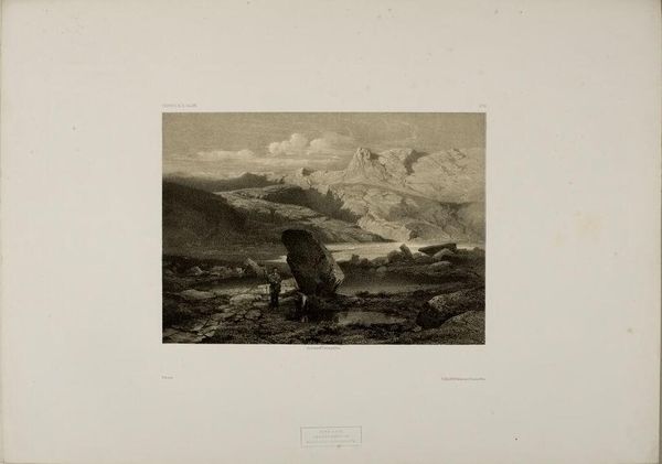 Curator: Eugène Cicéri created this vista, View of the Great Waterfall of Mont-Dor, Auvergne. Editor: The composition is striking! The stark contrasts of light and shadow really emphasize the ruggedness. Curator: Indeed. The waterfall serves as a potent symbol of nature's raw power, but the figures down below remind us of humanity's persistent presence within the landscape. Editor: The lithographic rendering, with its precise linework, emphasizes the geological forms, almost like a scientific study rather than a romanticized view. Curator: Perhaps, though the dead tree in the foreground also alludes to mortality and the cyclical nature of life. Editor: I see your point. Still, there's something wonderfully immediate about the way the scene is structured, like a diagram of spatial relationships. Curator: It's a powerful intersection of the empirical and the symbolic, isn't it? A glimpse into how we've historically framed our relationship with the natural world. Editor: Yes, it certainly makes me appreciate the precision and potential of black and white imagery.