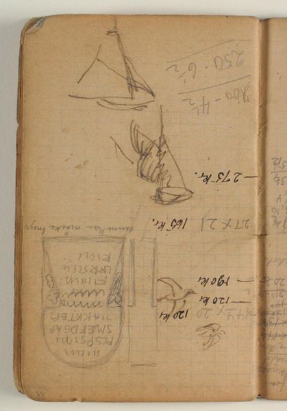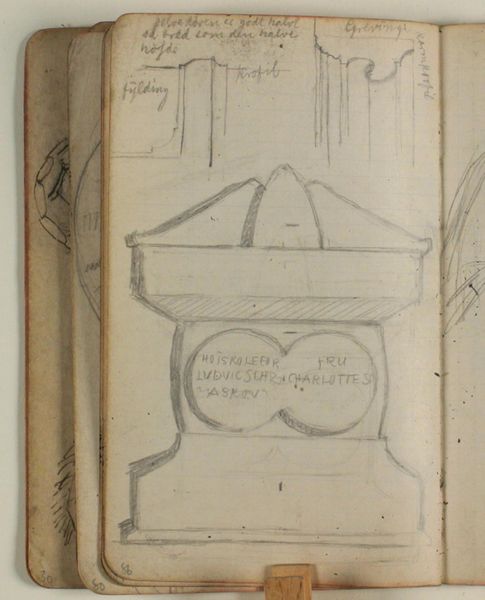 Curator: This piece, by Niels Larsen Stevns, created between 1930 and 1936, is called "Study of the Coopers' Guild Banner." It is a coloured-pencil drawing on paper, currently held at the Statens Museum for Kunst. Editor: It strikes me as more of a fleeting idea than a fully formed artwork. The loose lines and scribbled colour notations create this airy, ephemeral quality. What do you think? Curator: Absolutely. These kinds of preparatory drawings allow us a glimpse into Stevns' process as he considers the history and imagery of the Coopers' Guild. Consider how Guild banners in general operated, as symbols of identity and solidarity among workers, but also as markers of public presence in civic rituals. Editor: Right, the banner itself is such a potent image of community. It evokes a long tradition, doesn’t it? What I find fascinating is that the core imagery of the barrel would've carried a profound emotional weight, tied to the craft, livelihoods, and heritage of its members. Curator: It's interesting to consider the choice of Stenv to not execute a detailed rendering. This sketch privileges capturing symbolic elements over accurate representation. See, for instance, how the drawing focuses on the barrel, emphasizing its iconic presence as opposed to depicting every construction detail perfectly. Editor: A key symbol elevated above mere depiction. This makes you wonder what narrative it originally served. I see the inscription '1861', which may relate to an event for that specific year within the Guild’s life or perhaps some internal regulation or milestone. That in itself becomes its own kind of message. Curator: Indeed, these kinds of preliminary studies really draw out attention toward uncovering history. The drawing becomes an artifact, with its medium coloured pencil and all adding to its layered narrative about Guild identity and history. Editor: It also has an incredibly dynamic feel that almost conveys how important the banner must have been. A very powerful image, especially once its deeper context is revealed.