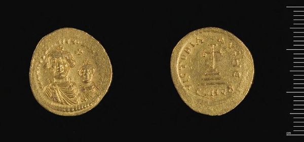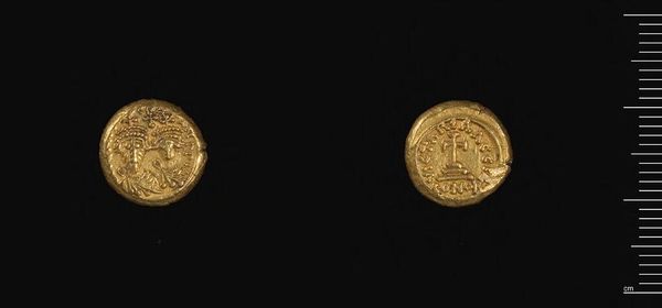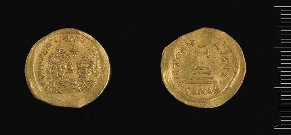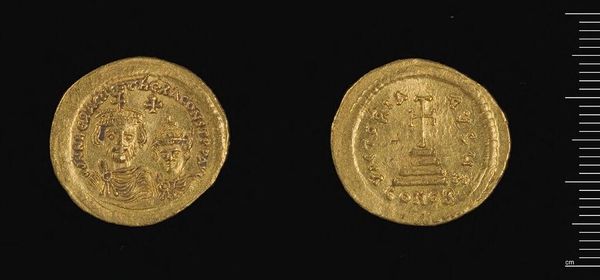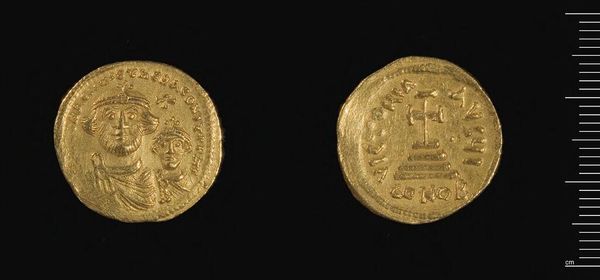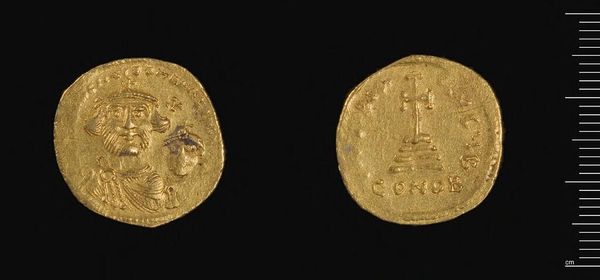 Curator: Here we have a gold coin of Herakleios, though it was produced under Abd-al-Malik of the Umayyad Caliphate. The coin weighs a mere 1.42 grams. Editor: Immediately, I am struck by how such a small object carries such weight, both literally in its material and figuratively in its historical narrative. Curator: Absolutely. Initially, Abd-al-Malik maintained the coin's Byzantine imagery, including depictions of Herakleios and Christian symbols. But this imagery soon became a point of contention in the growing Islamic empire. Editor: So, we see a fascinating negotiation of power through material culture here. The gold itself speaks of trade, of resources extracted and controlled, while the shifting imagery underscores a move toward asserting a new cultural and political identity. Curator: Precisely. The coin becomes a site of contestation, reflecting the tensions inherent in early Islamic rule and the eventual move towards distinctly Islamic coinage. Editor: It's a potent reminder that even the smallest objects can hold complex stories of identity, religion, and power. Curator: Indeed, a tiny but telling testament to monumental shifts.