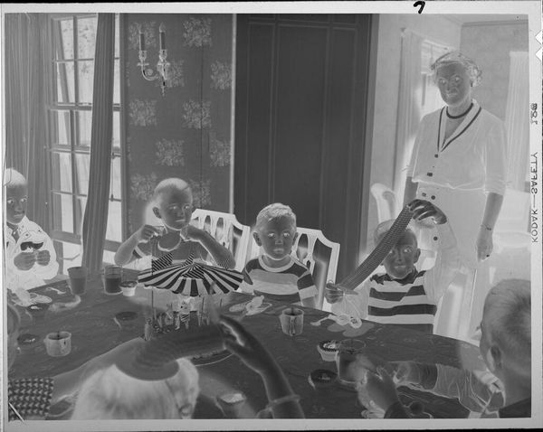 Curator: What a fascinating photographic document. This is an Untitled work, described as a "family portrait with many dogs and puppies," by Lucian and Mary Brown. It resides here at the Harvard Art Museums. Editor: It's quite striking, even in negative. The composition is intriguing with its subjects holding small dogs creating a pattern, and a giant dog taking over the couch. The tonal contrasts make it feel almost dreamlike. Curator: It's interesting to consider how photographic portraits like this reinforce middle-class values concerning family and domesticity in the mid-20th century. The sheer number of animals speaks to a certain level of comfort and privilege. Editor: Yes, and the formal arrangement of the figures draws your eye across the frame, reinforcing that sense of societal order. But the big dog's sheer size throws it off balance, doesn't it? Curator: Perhaps that disruption speaks to the inherent chaos of family life even under the veneer of order. The Browns are making a statement, however subtly, of their place in society. Editor: I agree. The careful composition of the figures combined with the photograph's tonal range really enhances the emotional resonance. It invites us to look deeper.