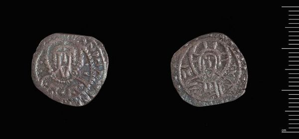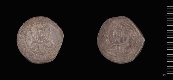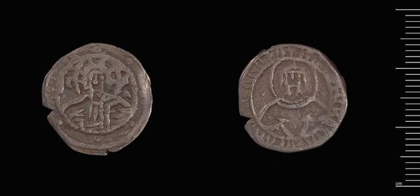 Editor: Here we have a Half-Stavraton of Manuel II. Looking at this coin, I'm struck by how much information it conveys in such a small space. What symbols stand out to you? Curator: The figure on each side holds significant weight. Consider the ruler depicted; the imagery would intentionally evoke power and authority. Do you notice any specific attributes or symbols associated with royalty? Editor: I see what looks like a crown or halo. Does that connect to the ruler's authority? Curator: Exactly. The halo suggests divine sanction, reinforcing the emperor's legitimacy. Think about how this imagery served to legitimize the emperor's reign and project power. Editor: I hadn't considered how potent such small images could be. Thanks! Curator: It's fascinating how visual symbols transmit cultural memory across generations.