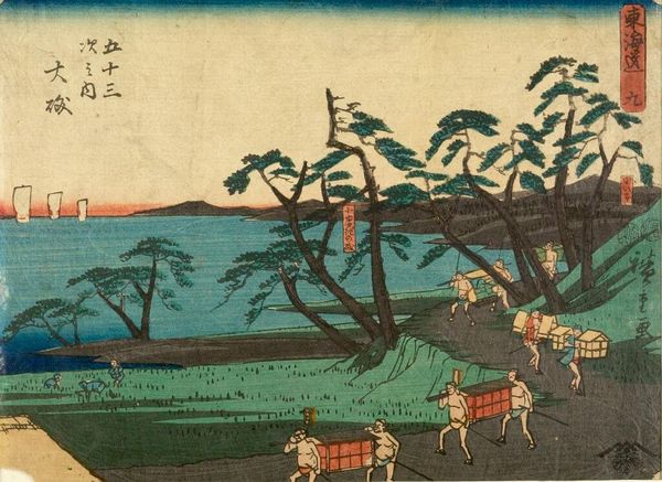Editor: This is *Travelers Passing a Village/ Yui*, by Hokusai, from the series *Exhaustive Illustrations of the Fifty-Three Stations of the TÅkaidÅ*. It feels so intimate, almost like a secret world. What do you see in this piece? Curator: Ah, Hokusai! I see a journey, not just across the landscape, but into the heart of Japan. Notice how the stylized clouds almost cradle the scene, like a memory being held dear. Do you feel that sense of stillness despite the travelers? Editor: I do. It's like they're part of the landscape itself. Curator: Precisely! Hokusai blurs the line between human and nature, suggesting a harmonious coexistence. It's a reminder that even in passing, we leave a trace, and the world leaves its mark on us. A beautiful dance, don't you think? Editor: Absolutely. It's given me a whole new perspective on Hokusai. Curator: And me on journeys!