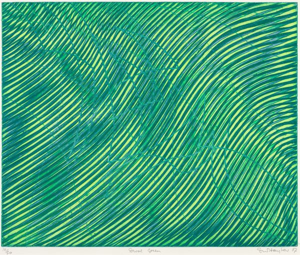 Curator: This intriguing print is by Sir Eduardo Paolozzi, held in the Tate collection. Though untitled, its bold imagery is immediately striking. What's your take on it? Editor: Well, the first thing that hits me is this vortex—it’s almost hypnotic, a dizzying spiral! And then, these peculiar figures above feel almost robotic. Curator: Yes! Those figures, repeated in vertical stacks, evoke the serial nature of mass production. Paolozzi often incorporated machine-like forms to reflect on technology's impact. The vortex—perhaps a symbol of infinite possibility or, conversely, an inescapable pull? Editor: Or maybe the pull is towards sleep. That little eye in the center looks like it's trying to go to sleep. Curator: It's remarkable how Paolozzi merges the mechanical with the psychological. Editor: Absolutely. It’s like looking into a dream, one where machines dance with our anxieties.