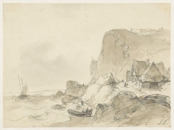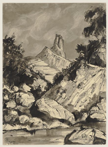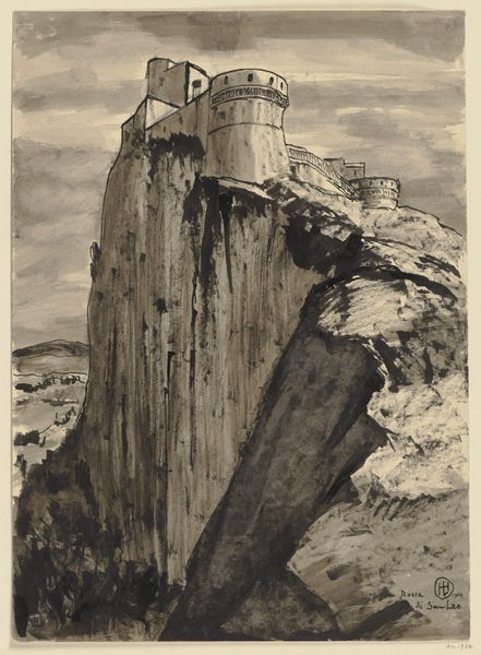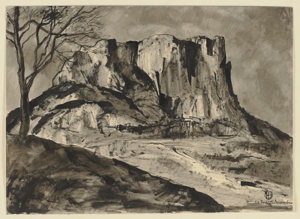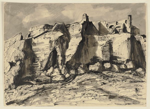 Editor: So, this is Hermann Lismann's "Les Baux-de-Provence," an ink drawing on paper, and what strikes me immediately is its almost theatrical sense of drama. It's so stark and monumental. What do you make of it? Curator: This drawing exemplifies the power of landscape to communicate societal anxieties and even national identity. Consider the historical context: landscapes like this, particularly depictions of ruins and historically significant sites, served as powerful reminders of the past and anxieties about cultural continuity in interwar Europe. The dramatic light and looming structure play directly into a romanticized vision of history. Editor: That's interesting! So, you're saying the choice of subject matter and the stylistic approach speak to larger concerns than just documenting a place? Curator: Exactly. It also hints at the romanticization of rural life and a potential rejection of industrialization, issues highly pertinent to that era. Do you think the museum setting changes the experience for the viewer? Editor: Absolutely! Placing it in a museum elevates it, framing it as something historically and culturally significant. It definitely prompts viewers to consider those wider contexts you mentioned. The composition, the monochrome palette, almost demand gravitas, don't you think? Curator: Yes, indeed. And the very act of Lismann choosing this subject reinforces existing power structures that prioritized these sites. Recognizing that reveals so much about both the artist and the socio-political climate of the time. Editor: I've never really considered how landscapes could be so politically charged! That's given me a whole new way to look at them. Curator: Glad to broaden your perspective! These drawings are historical artifacts as much as aesthetic objects.