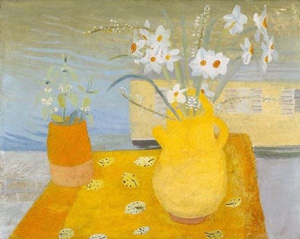 Winifred Nicholson created this evocative painting 'Recollect' with oil on board. The canvas presents a symphony of soft, muted tones, where yellows, whites, and blues blend in a hazy composition. The arrangement of flowers in transparent glass vases and lemons creates a sense of ephemeral beauty, underscored by the gentle, diffused light. Nicholson’s technique here is remarkable. The delicate brushstrokes and the way she layers colour create a sense of depth and luminosity. The semi-transparent quality of the vases challenges our perception, blurring the lines between objects and their environment. This technique destabilizes conventional representation, inviting us to consider the painting's exploration of light and colour as its primary subject. The subdued palette and the overall composition invite us to contemplate the intangible aspects of memory and perception. Nicholson expertly manipulates form and colour to create a space that resonates with a sense of quiet reflection and aesthetic inquiry, prompting viewers to interpret the semiotic interplay between visibility and form.