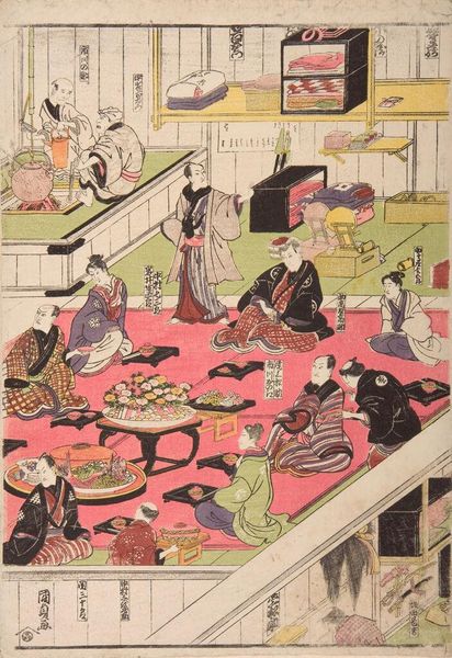 Curator: This is Utagawa Kunisada's "Nakamura Theater," currently housed at the Harvard Art Museums. Editor: It's a lively scene! The composition feels almost voyeuristic, like we’re peeking into a world of bustling activity and theatrical preparations. Curator: Kunisada, born in 1786, was a prolific printmaker. This piece likely reflects the vibrant entertainment culture of Edo-period Japan, showcasing the inner workings of a popular theater. The materiality of the woodblock print, the labor involved in its creation, speaks to the democratization of art at the time. Editor: I love how he captures the movement and energy, even the sense of anticipation hanging in the air. Look at the details of the clothing! It’s like each figure has their own story to tell. Curator: The details are crucial. The prints weren't merely decorative; they served as advertisements, celebrity endorsements, and records of cultural events, influencing trends and shaping public perception. Editor: I can almost hear the rustle of silk and the murmur of voices. What a gift to glimpse a moment in time, preserved in ink and wood. Curator: Indeed, a testament to the intricate relationship between art, commerce, and daily life in Edo. Editor: Definitely gives me pause.