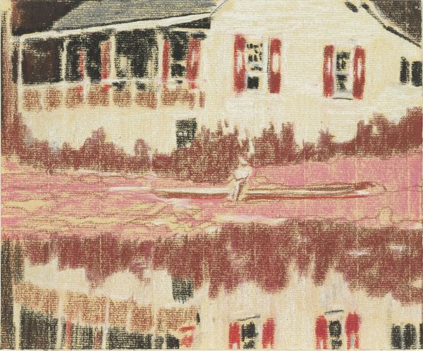 Editor: Here we have Peter Doig's "Camp Forestia" from 1996, rendered in acrylic paint. I’m immediately drawn to how the reflection seems almost like a ghostly doppelganger of the house itself. How do you interpret this doubling effect? Curator: It's precisely that sense of mirroring that intrigues me. Beyond a simple reflection, what societal narratives are present? This house, suspended between reality and its shadow, reminds me of the liminal spaces many marginalized communities inhabit. The idyllic facade confronts a murky, uncertain reflection. Editor: That’s a perspective I hadn't considered. I was so focused on the visual composition. Curator: Think about it: who historically had access to such idealized rural settings? The seemingly innocent image of a country house also speaks to histories of land ownership, privilege, and exclusion. Whose forest is this, really? Doig's masterful layering creates a haunting echo, a question of belonging. Editor: So you see the reflection not just as a visual trick but as a commentary on societal structures? Curator: Exactly. The use of realism complicates things further. It seems familiar and comforting but with this unsettling distortion below the surface. Where does this comfort stem from, and for whom? Editor: That gives me a lot to think about in terms of the painting’s historical and cultural context. It makes you wonder about the stories that aren't immediately visible. Curator: Indeed. Art allows us to critically examine these seemingly simple images and ask ourselves, "What is really going on here?". The uncanny and eerie stillness becomes charged.