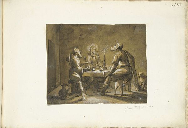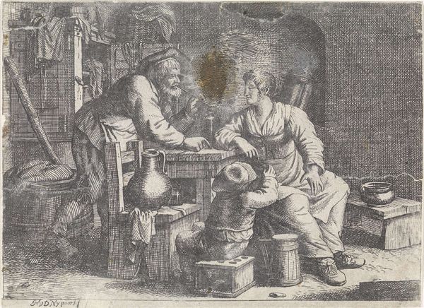 Curator: Welcome. We're standing before Adolph Tidemand’s oil on canvas painting, "The Sick Child," completed in 1851 and held here at the Rijksmuseum. Editor: Immediately, the gloom grabs me. It feels less like observation, more like eavesdropping on profound sorrow. That dimly lit interior just sucks you in. Curator: Precisely. Notice the prominent use of light and shadow. That single light source casts long, heavy shadows that contribute to the scene’s emotional weight. Light often signifies knowledge, divinity and goodness and here the single candle illuminates an ill child’s mother and father. In its symbolic context, light is meant to illuminate the value of human life. Editor: Absolutely. The light almost spotlights the mother’s face, highlighting her anguish. Her expression is the painting’s real center – she looks so…lost. Even though they both appear downcast, the composition, with the figures in each half, suggests different responses: a stoic, closed-off acceptance versus an open, painful awareness. Curator: That difference may underscore a conventional approach to the parents: we perceive the mother tending the child, internalizing the situation, versus a patriarchal idea that requires the man be seen stoicly distant, physically isolated, removed from direct caring roles. And consider the broader cultural memory it invokes; infant mortality was heartbreakingly common at the time, an everyday dread for many families. This visual echoes that trauma. Editor: Yes. This is genre painting with heavy subject matter, rooted in social realities, rather than a sanitized heroic or classical tableau. And Tidemand’s decision to depict the figures realistically, avoiding idealization, amplifies that sense of genuine human pain. Curator: He’s walking a tightrope here between Romanticism and Realism. The romantic inclination comes from its emotive charge but grounds that charge with social context. Editor: It’s not just about portraying an aesthetic ideal, but capturing truth—however raw. It reminds us of how deeply art can connect with the anxieties of its time. Curator: Ultimately, this is why a work like this retains such power. Despite the passing of centuries, it echoes basic human experiences like compassion, helplessness, and the will to love and protect our children. Editor: A somber but beautifully rendered reminder of our shared vulnerabilities. Makes you want to hold your loved ones tighter.