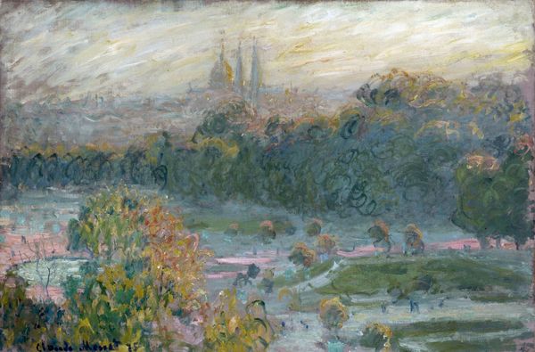 Curator: So here we have Albert Marquet's "Parisian Suburb," dating back to 1897. A small, but quite striking oil on canvas piece. Editor: My first thought? Serenity. The tones are muted, soft, but with enough punch to keep it from being dull. It reminds me of late afternoons when the light is doing its best to mellow out the day. Curator: Note how Marquet utilizes a high vantage point. This choice flattens the composition, emphasizing the interplay between the clustered buildings and patches of greenery. We can also detect the clear influence of Impressionism, particularly in his brushwork and concern with capturing fleeting moments of light and atmosphere. Editor: Absolutely, but it's like Impressionism viewed through a melancholic filter. There's a slight murkiness in the sky, those greens are deep, almost sorrowful, it feels much more toned down than the works of his peers, it does speak more about the essence than just raw optics. He must have loved this little vista so much to invest his emotions. I wonder what stood there? I always look out the same window, and what stands there definitely affects my day. Curator: An insightful point. The spatial organization is key as well; note how he disrupts conventional perspective, creating a sense of intimacy and immediate contact, even though he painted this image of the suburb from quite a distance. And if you look close you can distinguish his use of short, broken brushstrokes, the technique so pivotal in the aesthetic syntax of Impressionism and Post-Impressionism alike. Editor: So it's a dialogue between structure and freedom then! Because those houses with their brown and orange tiled rooftops, look how freely they peek, some behind trees, other more openly. A happy medium between the orderly arrangement of human life and the delightful chaos of nature. He seems to let each do their own thing. I guess Marquet didn't worry too much about order, and that might be what brings it such joy! Curator: I see it. Ultimately, "Parisian Suburb" shows how a supposedly simple cityscape can reveal deep nuances of seeing, feeling, and translating personal experience into the language of paint. Editor: Well said. It definitely whispered some quiet wisdom that I didn't expect from just a handful of dabs and brushstrokes! I'll take that image out the door with me, thanks to him.