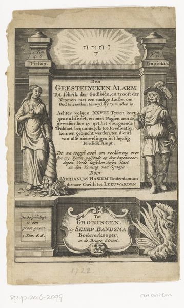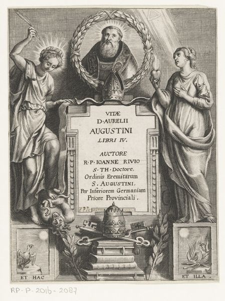 Curator: This engraving, "Justitia, Oorlog en Vrede", which translates to Justice, War and Peace, was created around 1657 by an anonymous artist. Editor: The austerity of black lines defining so grave a matter… one feels the weighty seriousness. Do you think the composition seems top-heavy? Justice looming, almost unbalanced above the title cartouche? Curator: Indeed, the engraving employs figuration and symbolism within a baroque aesthetic to present an allegory on war and peace, situated within a structured framework. Editor: Structure? Maybe a touch rigid for my taste, all straight lines. But I'm drawn to Justice's blindfold, you know? Like she's saying truth is truth, even if she can’t see it with her own eyes. And war to the left, so aggressive, and peace looks almost resigned to its fate. Curator: Note the detailed linework, indicative of printmaking during the period. Justice holds scales in one hand and a sword in the other; classic symbols signifying the balance and enforcement of law. War, depicted as a male figure in classical armor with a shield, contrasts with the serene female figure representing peace with an olive branch, symbols deeply embedded in western art tradition. Editor: I do like how the artist plays with the ideas though, you know? It is war and peace together. What are the cherubs doing at the bottom? Are they there just as playful decorations or they too are conflicted? Curator: The cherubs soften the gravity. The allegorical composition emphasizes the ever-present tensions between conflict and resolution, a contemplation on human conditions. Editor: It’s almost like a meditation… something so permanent etched into a print can do, something transient and human like you or me, or even these ideas of peace or war. I think this is a great little piece that gives food for thought. Curator: The careful study of line, form, and symbolic language grants the contemporary viewer much insight, I concur.