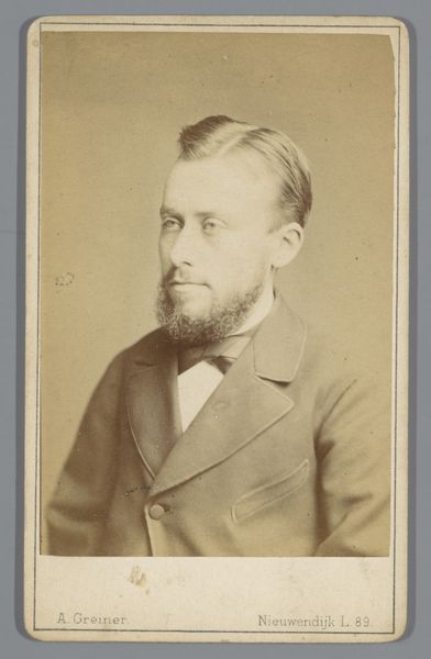 Editor: So, this is a photograph titled "Portret van de schilder François Antoine de Bruycker, halffiguur," created in 1861 by Joseph Dupont. It's a gelatin-silver print, and there's something very direct and unfiltered about it, particularly in the subject's gaze. How do you interpret this work within its historical context? Curator: This portrait offers a fascinating glimpse into the self-representation of artists during the mid-19th century and the rise of photography as a tool for shaping public image. The fact that a painter, De Bruycker, chose photography for his portrait suggests a strategic engagement with modernity. Consider the social currency of such an image. Who was this image meant for? Was it commissioned, or part of a larger series of artists' portraits destined for public display, perhaps within artistic societies? Editor: That’s interesting. I hadn’t thought about it as a deliberate act of image-making for a specific audience. I was just considering it as a study of this man. Curator: Indeed. Early photography allowed for wider circulation of images and therefore ideas. A portrait of an artist could enhance their standing and solidify their presence in the art world. The choice of realism, captured by the camera's objective eye, also resonated with the growing artistic movements of the time that valued portraying life as it was. But the question remains: how did this medium influence perceptions of artistry itself? Did it democratize portraiture, or create new hierarchies within the art world? Editor: I suppose photography would allow for the 'everyman' to gain entry into a world once reserved only for nobility. Thank you. I'll think of these early portraits as tools in social mobility! Curator: Precisely. It offers a reminder that art, even in its seemingly simplest forms, often plays a part in larger social and political dialogues.