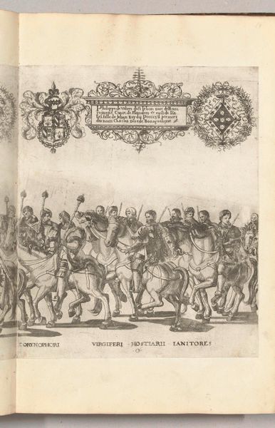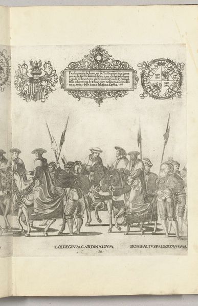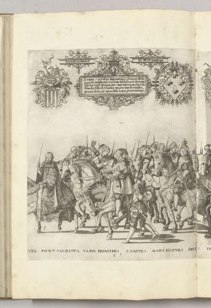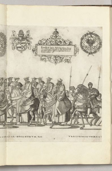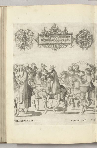 Editor: This drawing, from 1530-1536 by Nicolaas Hogenberg, is titled "Kerkgeleerden waaronder Nicolas Perrenot de Granvelle en Michele Maio." It's rendered in ink on paper and it's so detailed; it makes me wonder how long it took to create all these tiny lines! How does its historical context influence your reading of the piece? Curator: The key thing here is the *means* of production. Hogenberg, working in the printmaking tradition, was essentially part of a very early form of mass media. Look at the meticulous detail, achieved through engraving, and then think about the implications of reproducing and distributing this image. This isn't just about the individuals portrayed; it’s about power, patronage, and the circulation of information. Editor: So you’re saying the choice of printmaking as a medium impacts our understanding of the artwork? Curator: Absolutely! Printmaking allowed for a wider audience than a unique painting could ever reach. This engraving becomes a commodity itself, contributing to Hogenberg’s livelihood and fame, but also spreading the image and perhaps, the implied prestige of its subjects. Consider the labour involved - the artist, the printer, even the distributors - a whole network of production facilitated this image's existence and impact. What do you make of the heraldry framing the text above the riders? Editor: I hadn't really focused on those; they seemed purely decorative. Curator: They could reinforce ideas of power, lineage, or the elite circles these figures moved within, further legitimizing the subjects for the wider audience accessing the print. It raises interesting questions about value; both of the people depicted, and of the artwork itself, reproduced to perhaps increase that value. Editor: I never thought about it that way. I was just seeing a portrait, but the process and materials reveal so much more about its purpose and impact. Thanks! Curator: Exactly! Looking at the labor and materials lets us understand art as embedded within its economic and social environment. Always consider: how did this get made, and who benefited?