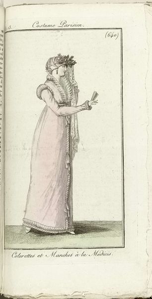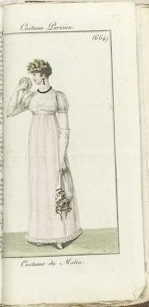 Curator: Before us, we have an intriguing print titled "Journal des Dames et des Modes, Costume Parisien, 1805, An 13 (630) Costume Paré," attributed to Horace Vernet, held in the collection of the Rijksmuseum. It's a pen drawing, almost a pen sketch in its feel. Editor: The first thing that strikes me is its elegant restraint, a subtle dance of lines that defines the figure. The monochromatic palette allows the structure of the garment to really take center stage. Curator: Absolutely. The very title suggests a connection to the rise of print media and the democratization of fashion trends. Think about it: previously, styles were disseminated through the elite. Now, printed journals brought these designs to a wider, increasingly bourgeois audience, creating new markets and new desires. Editor: And Vernet seems acutely aware of this. The flowing lines mimic the fluidity of fabric. It’s a fascinating study in how form creates its own context. Curator: We can also consider how this ties into the social roles of women in the early 19th century. Fashion became a crucial tool for expressing identity within carefully prescribed boundaries. Note the Neoclassical influences here too, with the high waistline and simple lines evoking ancient Greek aesthetics. Editor: Yet there's a touch of modernity. This isn't just a record, but a statement about artistry in production, almost a celebration of design and consumer culture that defines a pivotal shift toward recognizing individual tastes. Curator: I think the image encapsulates a burgeoning tension: the constraints of social decorum and new avenues for self-expression. It makes the role of production pivotal, doesn't it? Editor: Indeed. Studying art works of this kind gives us the context for looking at the nuances that emerge later. Curator: I agree. It’s a confluence of artistry and labor made available in consumer material!