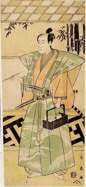 Curator: Katsukawa Shun'ei's woodblock print, simply titled "Actor," presents us with a figure steeped in the visual culture of late 18th-century Japan. Editor: Whoa, that robe! It's like a wearable maze. I wonder if he ever got lost in it himself. Curator: The geometric pattern is striking, isn't it? But beyond the aesthetic, it speaks to the social context of kabuki theatre during the Edo period and its role in reflecting and sometimes subverting societal norms. Editor: It feels incredibly modern, almost punk. Look at his face, too, that defiant stare. He's not someone you'd want to cross. I am also feeling a sense of protection. Curator: Precisely. Shun'ei masterfully captures the actor's persona, highlighting the complexities of gender, class, and performance in a rigidly structured society. The print, now residing at Harvard Art Museums, becomes a lens through which we can examine the intertwined relationship between art and social identity. Editor: I think I see the method acting. This makes me think that what we wear really is the projection of ourselves. Curator: Indeed, and it's through these kinds of investigations we enrich our understanding.