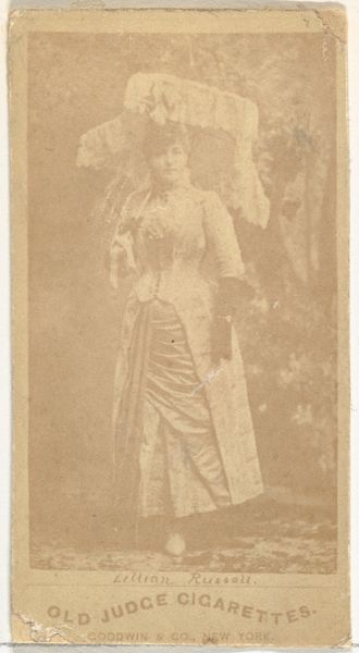 This is a trade card of Annie Pixley from the Actors and Actresses series, created by Allen & Ginter for Virginia Brights Cigarettes. The sepia tone of the card lends a nostalgic feel, enveloping the image in a uniform aged warmth. Pixley is adorned with an ornate floral dress, parasol and fan which creates a composition of repeating organic shapes that draw the eye across the frame. The composition is balanced and demonstrates the cultural codes in the late 19th century, in which the female form was often captured amidst symbols of beauty and delicacy. The layering of textiles and patterns—from the ruffles on her dress to the lace of her parasol—juxtapose the soft forms of the figure. Consider the interplay between the organic, ornate qualities of the dress and the geometric fan, against the backdrop, creating a dialogue between nature and artifice. This is a visual exploration of representation and a reflection of the aesthetic values of its time.