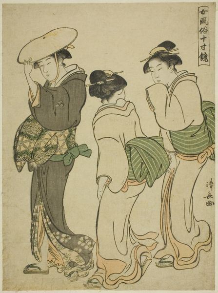 Curator: Let's turn our attention to a woodblock print dating from the late 18th century, created by Torii Kiyonaga, often simply titled "Print," and currently residing here at the Met. Editor: It strikes me as possessing a surprisingly modern feel, despite its age. There's a delicacy, a lightness in the figures that’s very appealing. Curator: Kiyonaga's work certainly reflects a mature approach to the Ukiyo-e tradition. Note how he manipulates line and form. The composition is meticulously arranged. Editor: But what does that arrangement signify? I see four figures, women primarily, in what seems like a domestic space – are we seeing an aspirational image of Edo-period womanhood? Who were these women intended for, and what role does class play in that dynamic? The one with the child looks particularly careworn, less idealized than the other two. Curator: Interesting point about class and lived experience. Though rendered using traditional techniques, Kiyonaga did seem committed to a kind of refined realism, elevating the everyday activities of courtesans and geishas to high art, with subtle but significant use of the conventions and limitations inherent in the Ukiyo-e woodblock print format. Editor: Right, Ukiyo-e was, at its heart, art for the masses. What kind of access would women have had to these kinds of depictions of themselves and others? What was Kiyonaga trying to express? His choice of subject invites critical questions about the objectification and fetishization of female beauty within the male gaze and economic system of that era. Curator: Indeed. The lines of inquiry these works provoke—regardless of their original purpose—make close attention rewarding still, centuries on. Editor: Ultimately, this piece is both a beautiful object and a mirror reflecting the complexities of its time, which demands our ongoing interrogation.