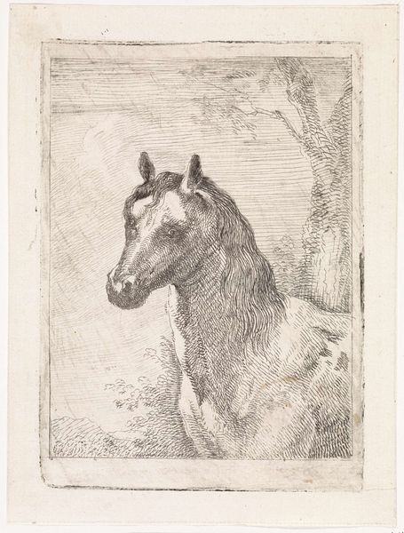 Aert Schouman created this etching, Paardenkop, or Horse's Head, sometime in the 18th century. Schouman lived during a time of shifting social structures and burgeoning artistic exploration in the Netherlands. He was known for his history paintings, but also for his animal studies. Notice the horse's calm demeanor, a quiet nobility rendered through fine lines. During this time, the image of the horse was tied to status and power, and Schouman, as many artists have done, walks the tightrope between representation and idealization. How does one capture the essence of an animal that carries so much cultural baggage? This piece invites us to consider the historical relationship between humans and animals, and how art both reflects and shapes our perceptions. It prompts questions about domestication, labor, and the stories we project onto the animal kingdom.