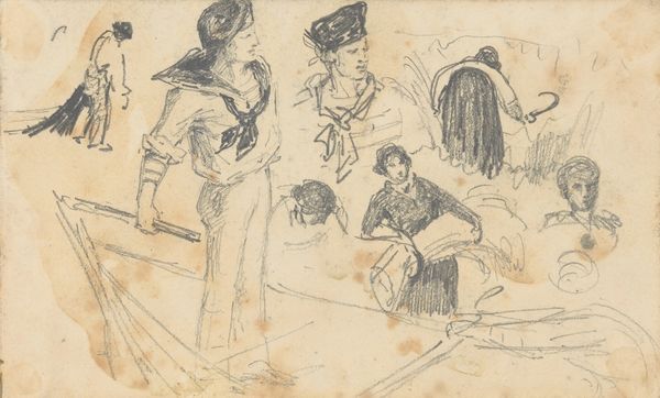 Editor: This is "Studieblad met schetsen van personen," a study sheet with sketches of people by Gerrit Willem Dijsselhof, made sometime between 1876 and 1924. It's at the Rijksmuseum. It looks like a page torn from a sketchbook, with several figures rendered in pencil. I am fascinated by the apparent freedom that the artist granted himself, focusing on his initial idea more than any particular style or the desire to refine an individual figure. What catches your eye in this work? Curator: I'm drawn to the sheer act of creation visible here. The pencil, the paper - these are the basic tools of artistic labor. Each mark represents a decision, a moment of interaction between Dijsselhof and his materials. This wasn’t necessarily meant to be viewed as ‘art’ in the traditional sense; it seems closer to a record of artistic labor. Do you think viewing this page as such alters our understanding? Editor: Definitely. Seeing it as part of the artist's process, rather than a finished product, makes me consider the economics of art. How much time, and thus, money, goes into what we consume as the completed image? And it makes me wonder, who was Dijsselhof sketching? What were their social roles, if anything at all? Curator: Exactly. Consider the clothing, the hats. These sketches provide clues about the sartorial conventions and social strata of the time. Each quick stroke builds into social insights; it's less about capturing perfect likenesses, more about rapidly depicting individuals participating in the spectacle of society. Does seeing it in this light change how you value the image? Editor: It does. Thinking about the materials and labor makes it much more vivid. Thanks! Curator: Indeed. Reflecting on the conditions of creation offers new perspectives and new appreciation.