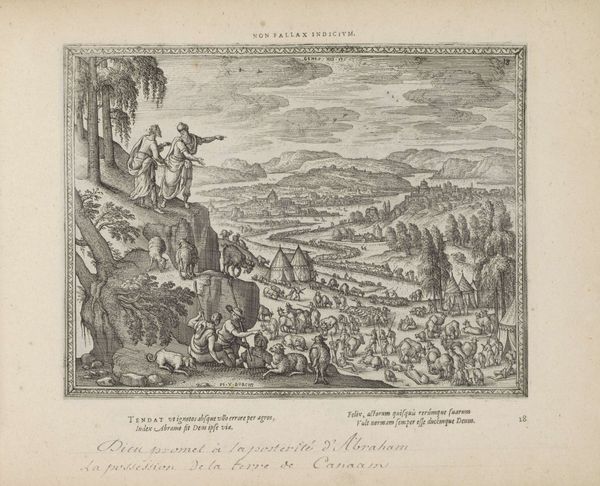 This is Pieter van der Borcht the Elder's "Landscape with the Sacrifice of Isaac," an engraving made in the Netherlands around 1600. The image depicts the Old Testament story of Abraham's willingness to sacrifice his son Isaac to prove his faith in God, but it also contains a broader reflection on the relationship between religious belief and the natural world, a theme prevalent in Netherlandish art of this era. Van der Borcht's work participates in the tradition of landscape art, where the natural environment is used to convey symbolic and moral meanings. In the late 16th century, the Netherlands was undergoing significant religious and political upheaval. The rise of Protestantism challenged the authority of the Catholic Church, and the Dutch Revolt against Spanish rule was in full swing. In this context, an image such as "Landscape with the Sacrifice of Isaac" could be seen as a commentary on the nature of faith, obedience, and sacrifice. The cultural, political, and religious context of the time shaped the way artists like Van der Borcht approached their work, imbuing it with layers of meaning that resonate with the social structures of their own time. By studying historical texts, religious treatises, and artistic conventions, we gain a richer appreciation for the complex interplay of social, religious, and artistic forces that shaped Van der Borcht's engraving.