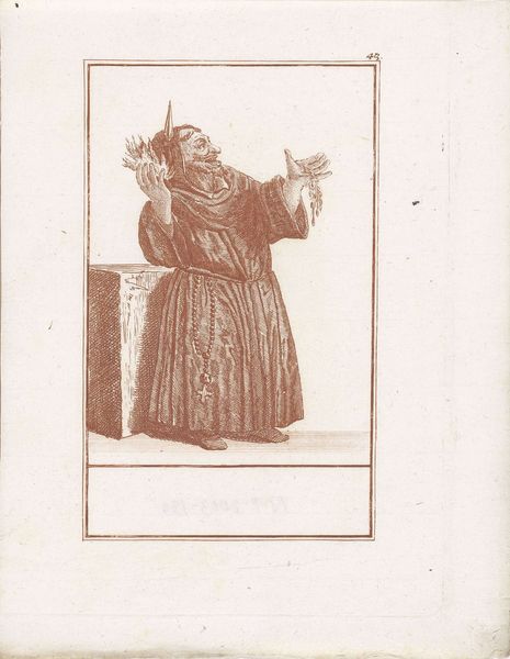 Jacob Gole produced this engraving of a 'Standing Monk with a Snake on his Head' sometime between 1660 and 1737. The image depicts a figure in obvious distress, apparently shocked by the snake now coiling on his head. It's important to remember that the Dutch Republic was a major center of international trade at this time. Gole's work reflects the cultural exchanges taking place, responding to and shaping Dutch perceptions of the wider world. The tile floor might be familiar to Dutch viewers, but the figure's clothing and physical features suggest someone from outside Europe. The snake, in this context, becomes a symbol of the unknown, of the potential dangers and surprises that come with global interaction. The Rijksmuseum holds a wealth of prints and drawings that illuminate how the Dutch understood and represented other cultures. Art historians sift through these visual records, combining them with written accounts and material artifacts, to better understand the complex, often fraught, history of cultural exchange.