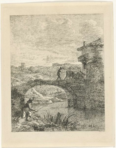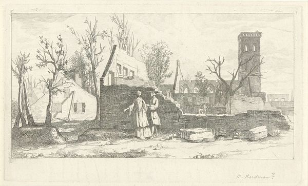 Curator: Well, what a find. We are looking at "Landschap met ruïne" or, "Landscape with Ruins", created by Marten Houtman, sometime before 1781. It's an etching, ink on paper. What's grabbing you first? Editor: The starkness. The barest wisp of lines building this decaying architecture... It feels desolate, like a forgotten corner of a once grand past. But look at those tiny figures, they seem so placid, almost romantic! What's your read? Curator: Definitely that contrast. See how the crisp etching defines the crumbling brickwork, and makes those textures almost palpable? I think Houtman is really interested in showing us labor, right? Someone built these arches, quarried this stone… it’s not just “nature.” The paper too, even – its own making. It gives presence to process, and to the folks who lived and toiled around these spaces. Editor: Right, so you're saying Houtman's focus is less on the romantic ruin, more on the labor implied by its decay? I guess, though…it’s still kind of melancholic, no? All these vertical lines collapsing... Maybe that romance just hits differently for me? Curator: Maybe! And look, landscape itself had a specific, evolving kind of labor woven into its very fabric, even in the late 1700s when this work came about. This wasn't about nature *per se*, but showing off wealth. It shows both the power of architecture and its ephemerality – and thus is able to suggest new kinds of relations through it. Editor: It definitely sparks something… the thought that we are only temporarily separated by time and space from other artisans of ages past… Thanks, I see the image in an even brighter, broader way! Curator: A fine way of describing how landscapes are truly produced! It makes you wonder what folks centuries from now will make of our ruined cities.