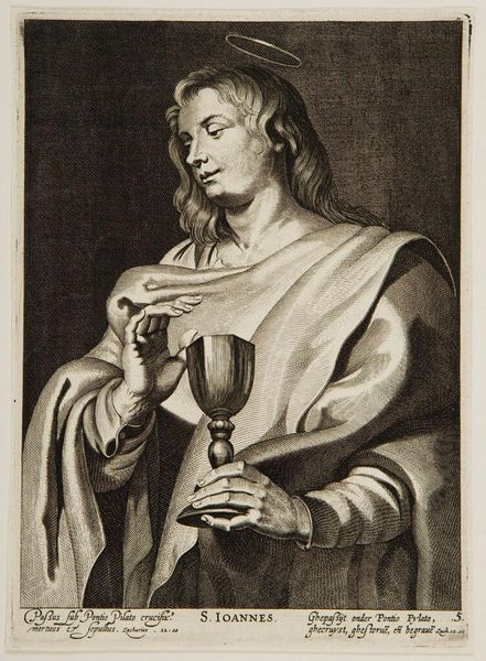 This is Nicolaes Ryckmans' engraving of Apostel Johannes, created in the late 16th or early 17th century. Note how the composition directs your gaze along the curves of John’s body towards the chalice he holds with poised reverence. The artist uses hatching and cross-hatching to model form and to create tonal contrasts. Light seems to emanate from the saint himself. This highlights the soft drapery which accentuates the rounded face and long wavy hair framed by a subtle halo, all of which contributes to a sense of purity and spiritual grace. Ryckmans's focus on line and form invites us to consider the symbolic weight of the image within its religious context. The chalice, a visual signifier of the Eucharist, anchors the composition and encourages a reading of John as a guardian of sacred mysteries. The aesthetic choices here function beyond mere representation. They serve as a means to communicate deeper theological concepts about faith.