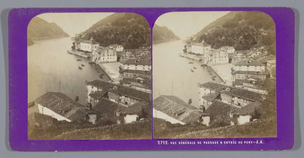 Curator: The initial feeling I get is one of meticulous stillness, an almost staged, peaceful quality. The subdued palette emphasizes that. Editor: Agreed, there is a quietude to the scene. Let's consider "Gezicht op Thun," a stereoscopic cityscape created by Florentin Charnaux after 1873. This is a photographic work augmented with colored pencil and watercolors, producing this tonality. Curator: I'm particularly intrigued by Charnaux's deliberate layering of mediums, and how this challenges the notion of photography as purely a mechanical form of reproduction. He intervenes manually in the process, which moves this work beyond a simple depiction and introduces the artistry inherent to crafted photographic pieces. It’s no mere capturing of a place, it’s a manual construction using the apparatus. Editor: It speaks to how art serves ideological purposes. Here, the selection and framing offer a view of civic stability—emphasizing order. The serene cityscape seems detached from any form of labor or social issues. It focuses, consciously or not, on an idyllic facade of the era that arguably papers over its underbelly. Curator: That reading is valid. However, I see Charnaux less as consciously obscuring realities, and more drawn to a pursuit of novel approaches using readily available technology of that moment to produce captivating scenic images for growing tourist markets. It is a beautifully crafted photograph that speaks volumes to contemporary photographic production trends in that time. The addition of watercolor and colored pencil is an overt gesture of making—labor in the photographic arts. Editor: A tourist’s gaze has political consequence; consumption, selection, and emphasis are forms of asserting and preserving certain positions, which is why critically investigating all aesthetic decisions is essential. The picturesque framing and careful colouring amplify the feeling of sublime beauty that may unintentionally overlook the everyday struggles of inhabitants within this beautiful cityscape. Curator: Ultimately, Charnaux’s meticulous artistry serves not only to elevate the status of photographic art, but shows us the labor involved in crafting an image—literal and conceptual—while subtly revealing the intersection of landscape, labour, and burgeoning touristic views. Editor: It truly illustrates how photography can engage in complex ways with representations, and, through thoughtful deconstruction, spark an insightful conversation regarding place and power dynamics.