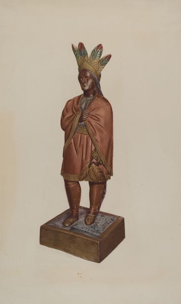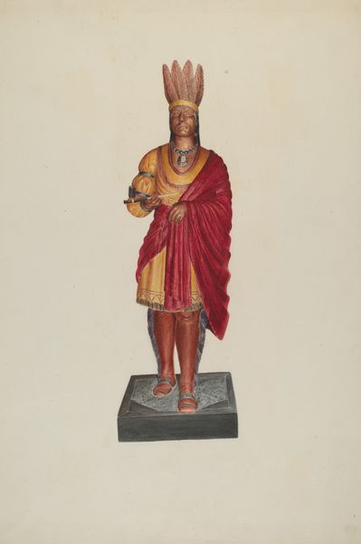 Lucille Lacoursiere made this watercolor of a Cigar Store Indian, we don't know exactly when. It has a directness to it, an unpretentious clarity, like folk art. Look at the way the colors define the statue, how she uses clean lines and simple shading to give it form. The palette is earthy, but with these surprising pops of green and red, creating a dynamic tension. The paint looks thin, almost transparent, allowing the paper's texture to peek through. See the way Lacoursiere captures the texture of the wooden figure? You can almost feel the roughness of the carved skirt. This piece resonates with the work of artists like Joseph Yoakum, who found beauty in the everyday, transforming it into something magical. In the end, art is a conversation across time, a continuous exchange of ideas and perspectives.