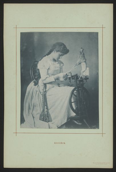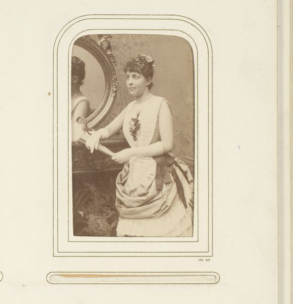 Curator: Ah, yes, this photographic portrait is titled "Portret van een vrouw, staand bij een tafel met bloemen," dating roughly between 1870 and 1890 by Benque et Klary. Editor: The initial mood is serene, almost dreamlike. The sepia tone gives it a quality of fading memory. Curator: Indeed, observe how the materiality contributes to this. The photograph itself, printed on albumen paper, a common process then, created from egg whites to bind light-sensitive chemicals to paper. Editor: It’s interesting, that choice. The use of something so domestic to fix a captured image, creating this enduring portrait. I see a strong association with traditional depictions of femininity—the flowers, the lace on her dress, even the way she leans demurely on the table. Each carries cultural symbolism of the late 19th century. Curator: Absolutely, let’s not overlook the material wealth evident here too. The detail and quality in rendering of her dress shows skilled craftsmanship; there is evidence of access to luxury in the quality of paper, dyes, even studio setting which, when combined, underscores her class. The twisted legs of that table must have required hours of labour to craft. Editor: Precisely. It reinforces a reading where these symbols intertwine with social identity and position. The floral arrangement, too, strikes me; its overflowing abundance could signal prosperity and, maybe, a certain idealized domestic sphere she occupies. Do you notice the miniature painting propped on the mantel? Curator: It speaks to both personal narrative and commercial photography's increasing accessibility. Editor: Considering how the subject posed formally, this might represent societal aspiration and self-presentation more than simply recording likeness. The symbols offer a rich language to consider this through. It has the timeless allure that persists because such visual cues remain potent cultural indicators. Curator: I concur; looking through that lens makes us understand that we examine not just a person, but production methods and cultural values inherent to it, revealing a compelling blend of intention and process. Editor: And the emotional and symbolic power inherent in the image; these are the qualities that cause it to transcend time.